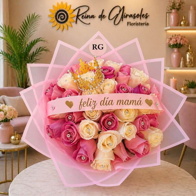 Bouquet x 24 Rosas Rosadas y Blancas + Coronita